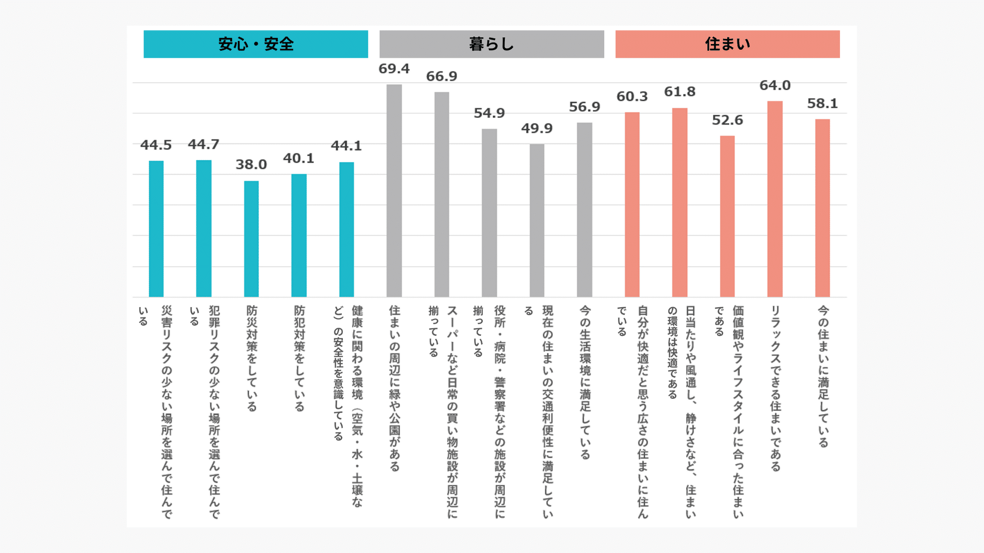 「住まいの周辺に緑や公園がある」「スーパーなど日常の買い物施設が周辺に揃っている」「リラックスできる住まいである」が上位にランクインし、生活環境面での充足度が高いことがうかがえます。