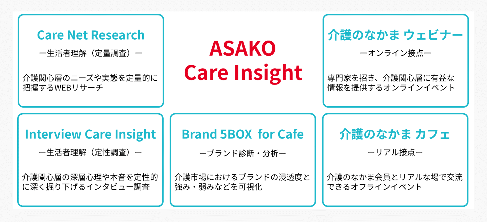 「ASAKO Care Insight」は、介護市場における貴社のマーケティング課題を解決するための、5つの専門性の高いソリューションを提供します。それぞれのソリューションは、貴社の課題に応じて単体での利用も、組み合わせての活用も可能です。