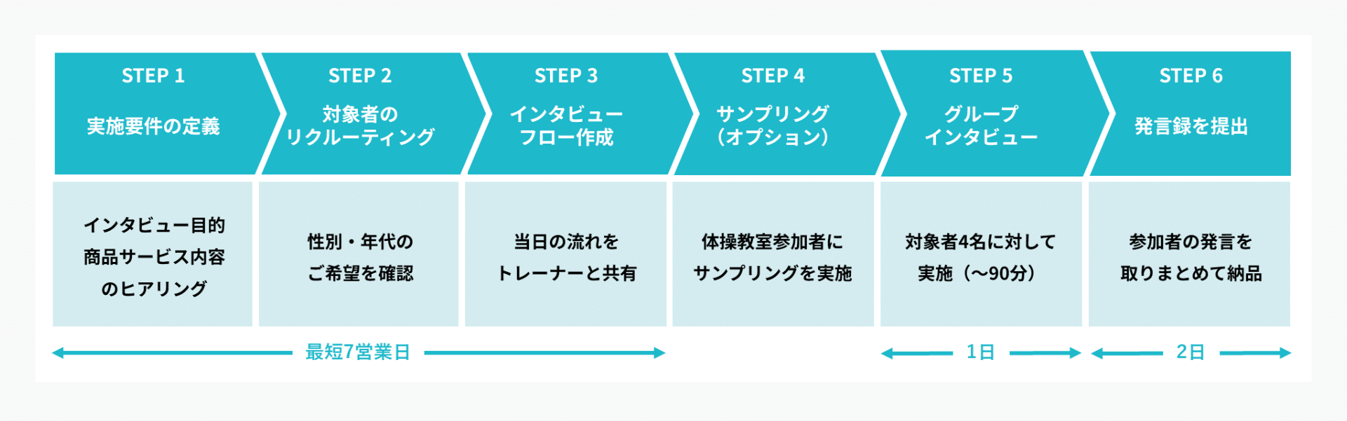 次に、ヒアリングの内容に基づき、対象者を抽出し、調査項目をまとめてトレーナーと共有。当日は、対象者4名に約90分のグループインタビューを行い「シニアの本音」を引き出します。シニア層の貴重な意見を最短10日間で収集、ご報告させていただくソリューションです。
