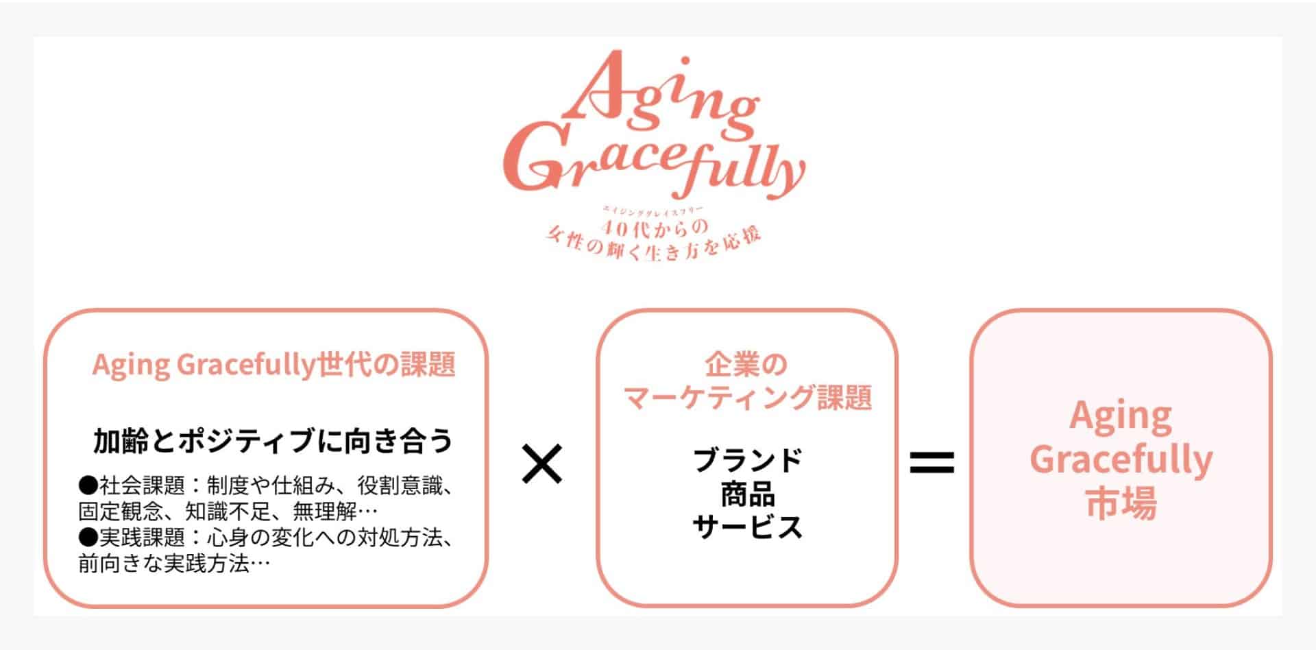 本プロジェクトは、加齢とポジティブに向き合うことで新たな市場を創造することを目指します。40代・50代女性の抱える「心身の変化への対処方法」「知識不足」「社会的な固定観念」といった課題に対し、企業の商品やサービスを通じて解決策を提供し、単なるマーケティングに留まらない社会的意義のある活動として展開します。