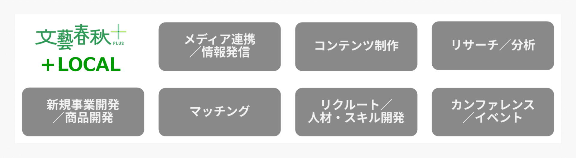 「+LOCAL」が制作する動画コンテンツは、地域課題解決に取り組む自治体の首長や、地域を支える企業のキーパーソンへのインタビューを通じて、その取り組みの深さや熱意を届け、共感と支持を広げます。さらに「地方創生」における様々な課題に対応するために、リサーチ・分析、戦略策定、コンテンツ制作、イベントの運営から新規事業開発や人材・スキル開発まで多岐にわたるソリューションメニューを提供しています。