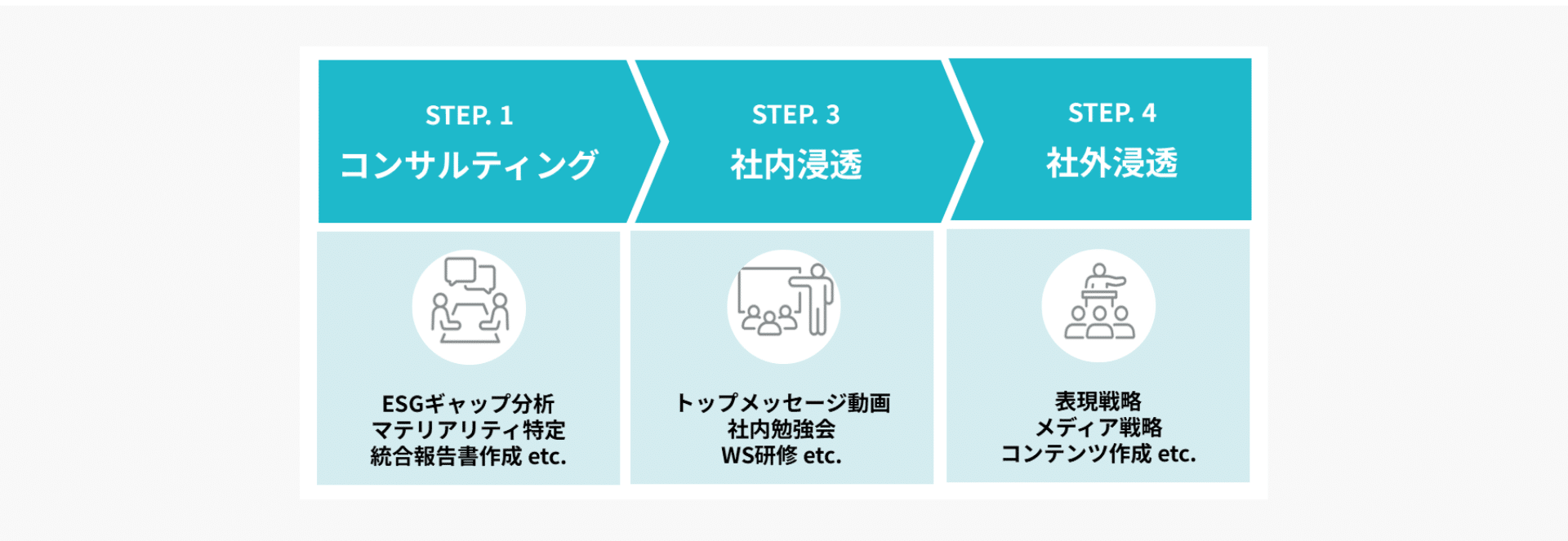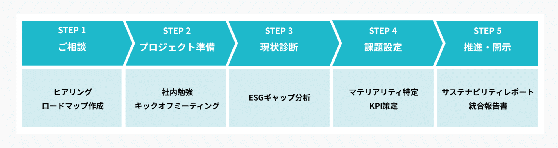 最初にヒアリングの上、全体ロードマップをご提案します。また、プロジェクトの準備として、社内向け勉強会やキックオフMTGを実施。その上で、ESGギャップ分析で現状を診断し、マテリアリティ(重要課題)の特定と、目標KPIの策定を行います。最終的にサステナビリティレポートや統合報告書を作成し開示していきます。