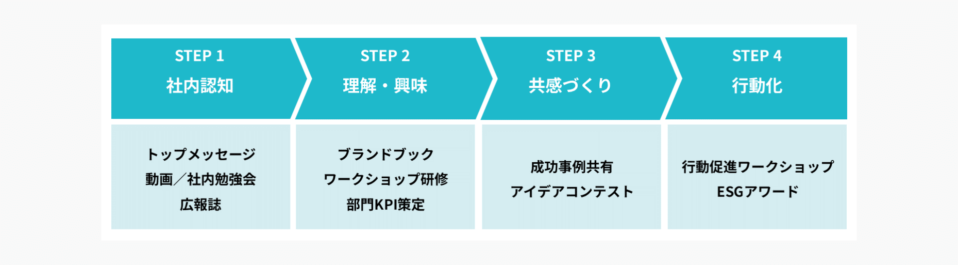 トップメッセージ動画や社内勉強会・広報誌などで社内認知を促進。ブランドブック作成やワークショップ(WS)で社内の理解・興味を深め、成功事例共有やアイデアコンテストで社内の共感を醸成します。さらに、行動促進WSや制度強化、ESGアワードなどで社員の行動化を図ります。