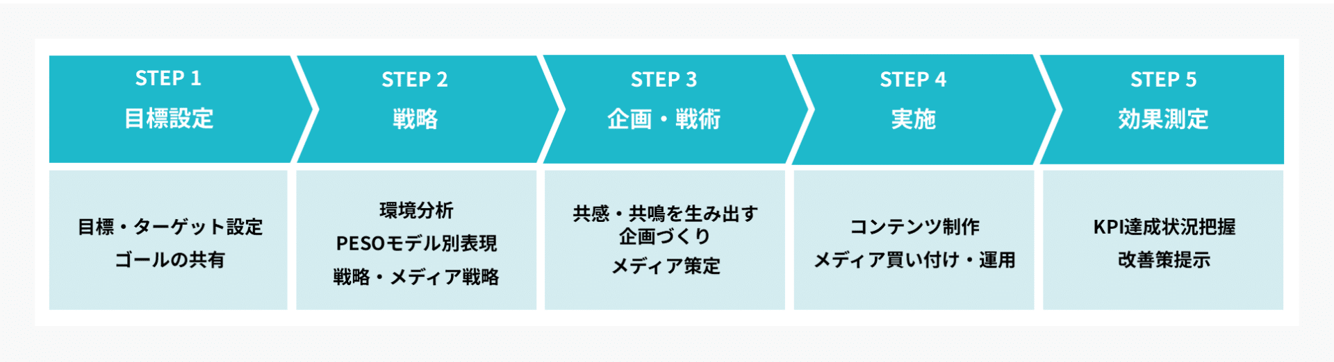 目標やターゲットの設定とゴールの共有を行った後、市場の環境分析を行い、PESOモデル別の表現戦略やメディア戦略を策定します。共感・共鳴を生むコンテンツづくりやメディア策定を行い、コンテンツ制作やメディア運用を実施します。効果測定では、KPI達成状況を把握するほか、具体的な改善提案でPDCAを行います。