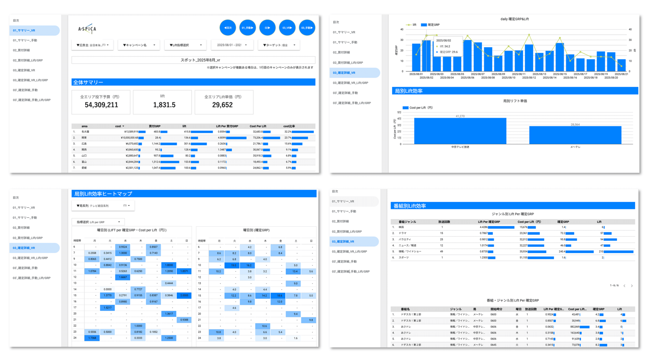 「A-SPiCA」ダッシュボードは、テレビCMとデジタル施策の効果を統合的にモニタリングし、包括的な分析を実現します。テレビCMとCV(コンバージョン)の相関分析、放送局別・クリエイティブ別の詳細な成果測定を一元化することで、投資効果の可視化を図ります。どの局・番組が最も費用対効果が高いか」「ゾーン設定の最適解は何か」「反響を最大化するクリエイティブはどれか」といった戦略的課題に対し、データドリブンな明確な解答を提供し、テレビCM出稿戦略の最適化を支援します。
