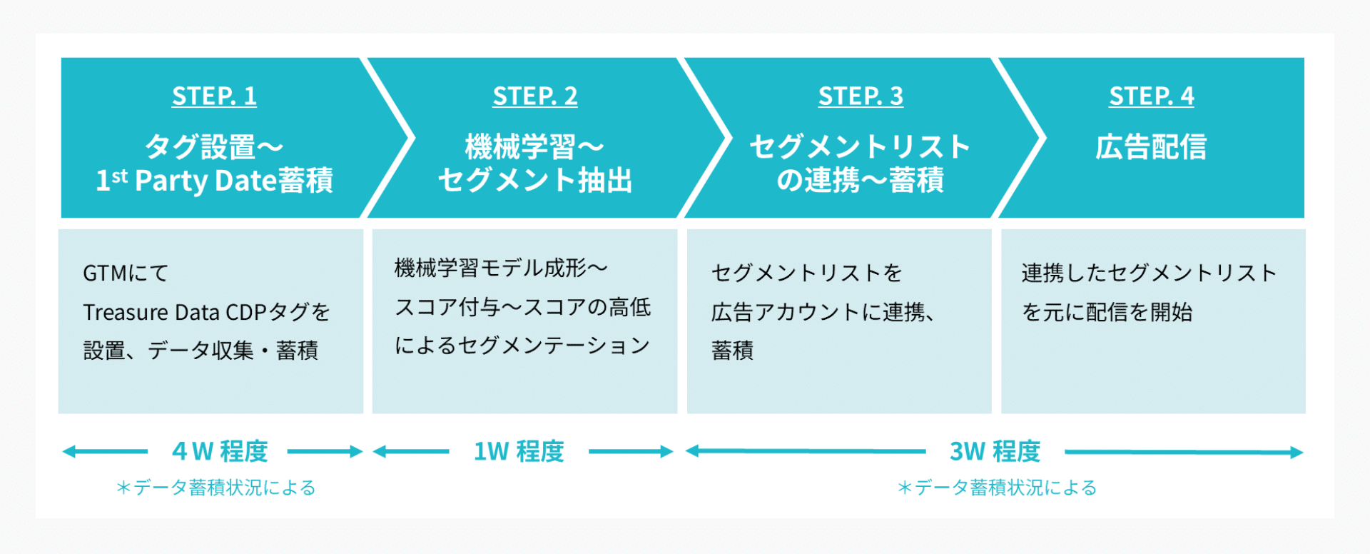 CPOの導入から運用までは、以下のプロセスで進行し、概ね2ヶ月程度で配信を開始。1st Party Dataを最大限に活用した広告最適化を実現します。