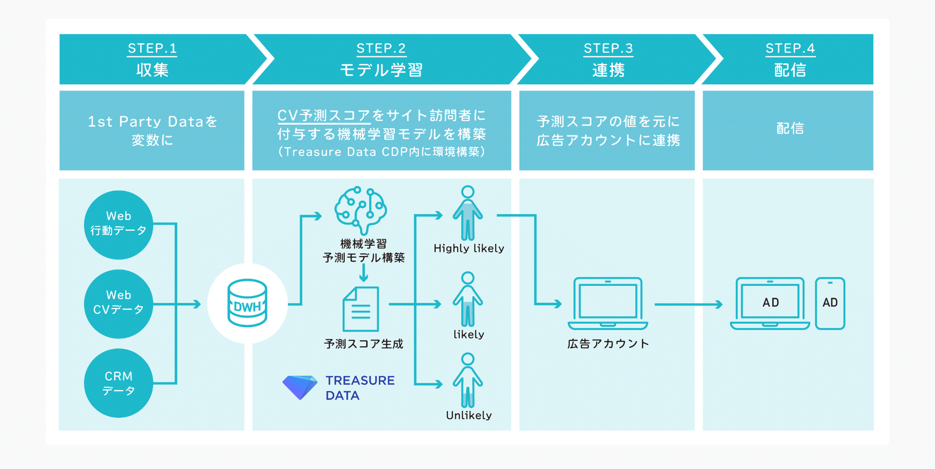 - このモデルは、Treasure Data CDPなどの環境に構築され、CVに至ったユーザーの特徴や行動パターンを深く学習します。
