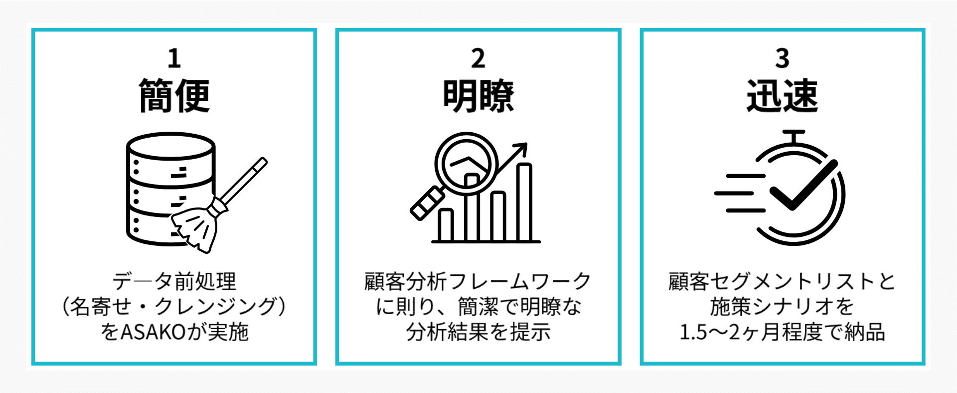 顧客データ活用の大きな障壁であるデータ前処理は当社が代行します。これにより貴社は戦略立案に集中でき、分析開始までの時間を大幅に短縮可能です。煩雑な作業から解放され、より本質的な顧客分析と施策検討にリソースを集中できるため、効率的なデータ活用が実現します。
