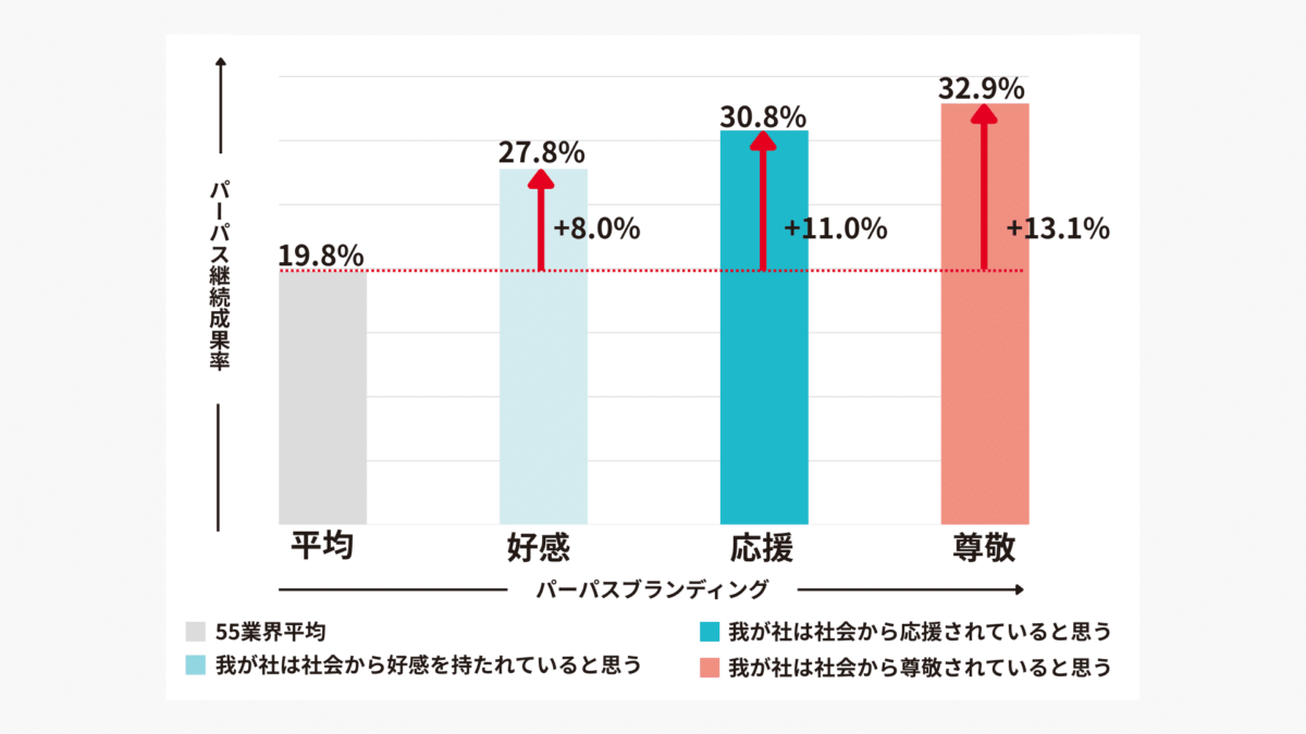 社外から「好感・応援・尊敬」を得ていると社員が感じている企業ほど、継続成果率が高いことが示されています。特に「社会から尊敬されている」と感じる企業では、55業界平均より13.1%も高くなります。