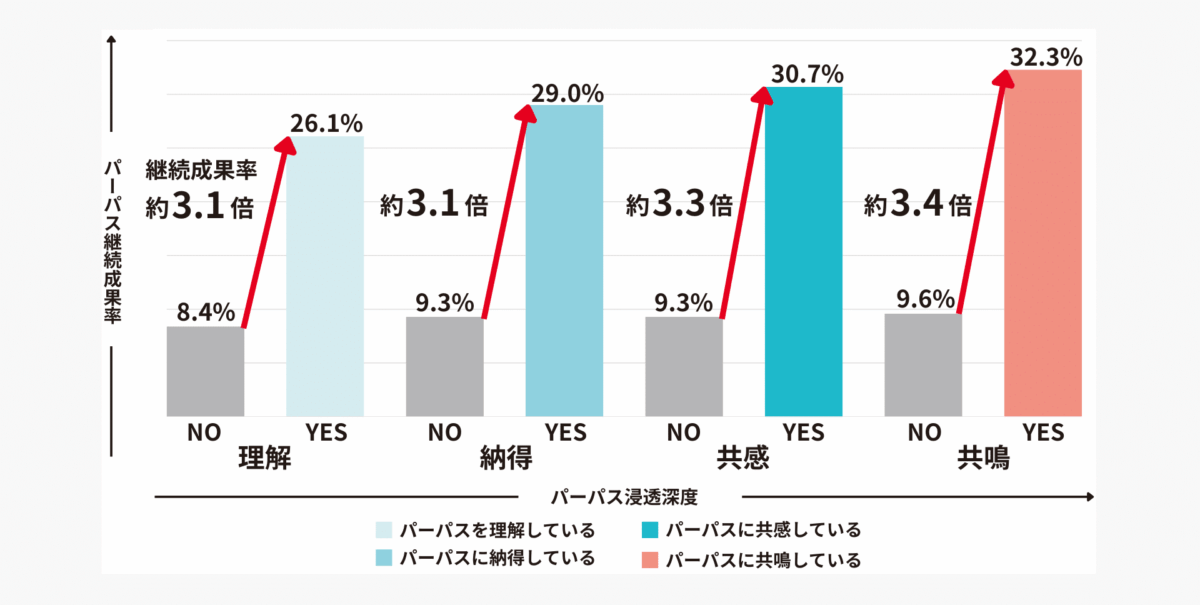 パーパスを「理解・納得・共感・共鳴」していると社員が感じている企業ほど、継続成果率が高い結果です。特に「共鳴」している社員がいる企業では、継続成果率が約3.4倍も高まることが確認されました。