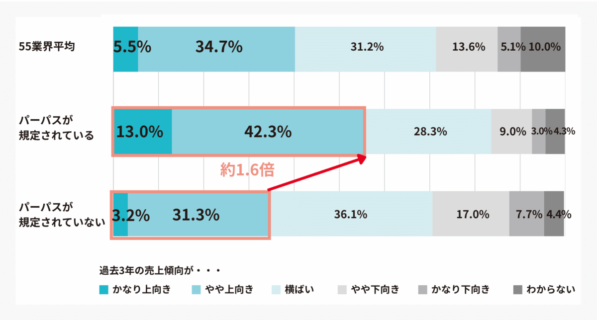 パーパス浸透は企業業績に顕著な好影響を与えることが明らかになりました。パーパスが規定されている企業は、そうでない企業に比べ、過去3年程度の売上が約1.6倍も上向き傾向にあります。売上総利益や営業利益率でも同様の結果が見られます。
