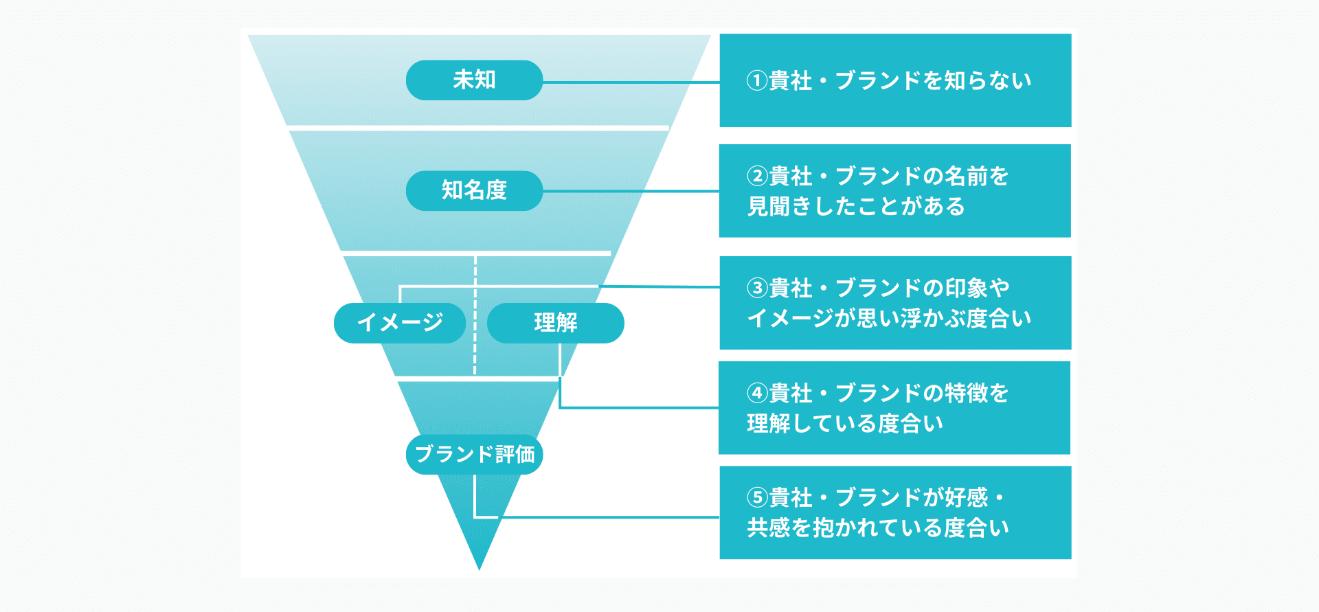 「認知度」から「共鳴感情」までの流れを掴むことで、ブランド構築に向けた「ボトルネック」と「機会」を明らかにします。