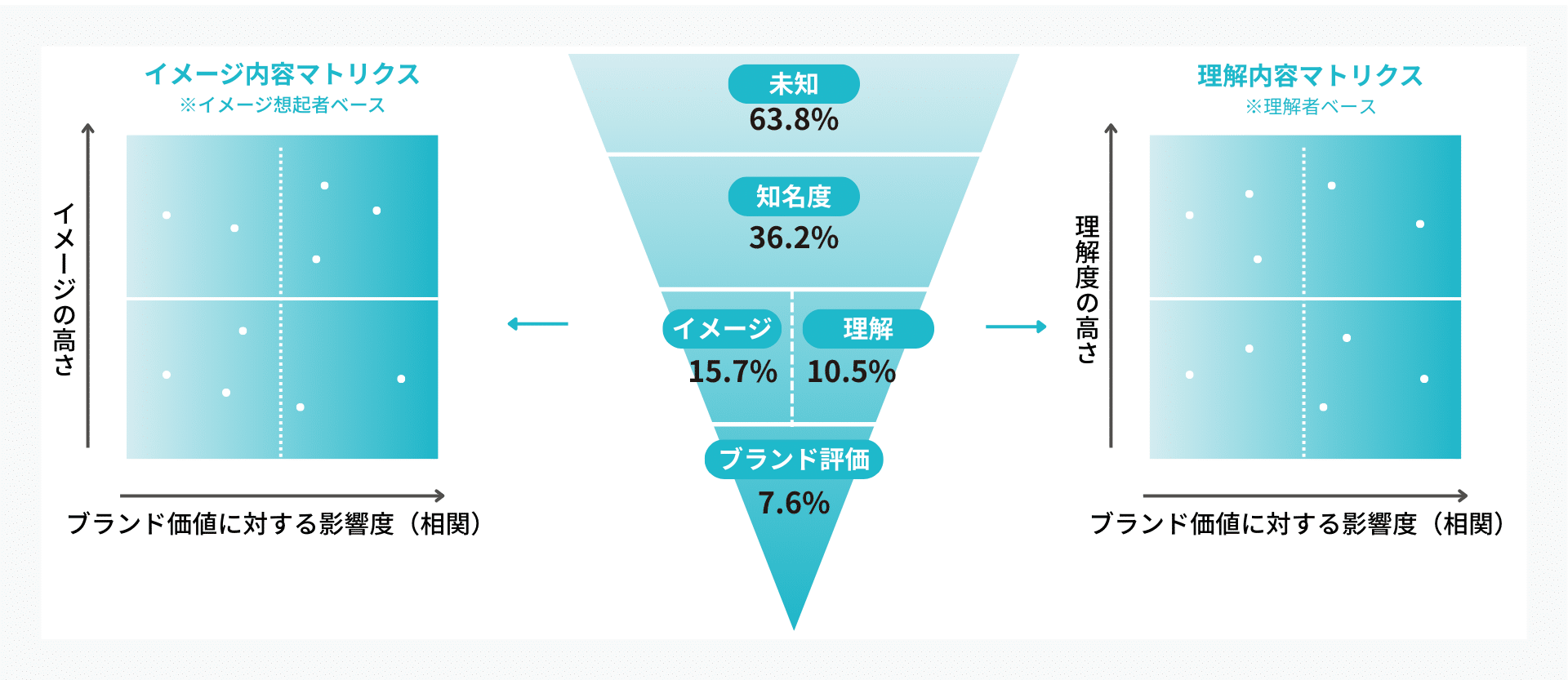 貴社が想起されている、感情的な「イメージ内容」と論理的な「理解内容」をマトリクス診断することでブランド価値に影響を与える「イメージ内容」「理解内容」を明らかにします。