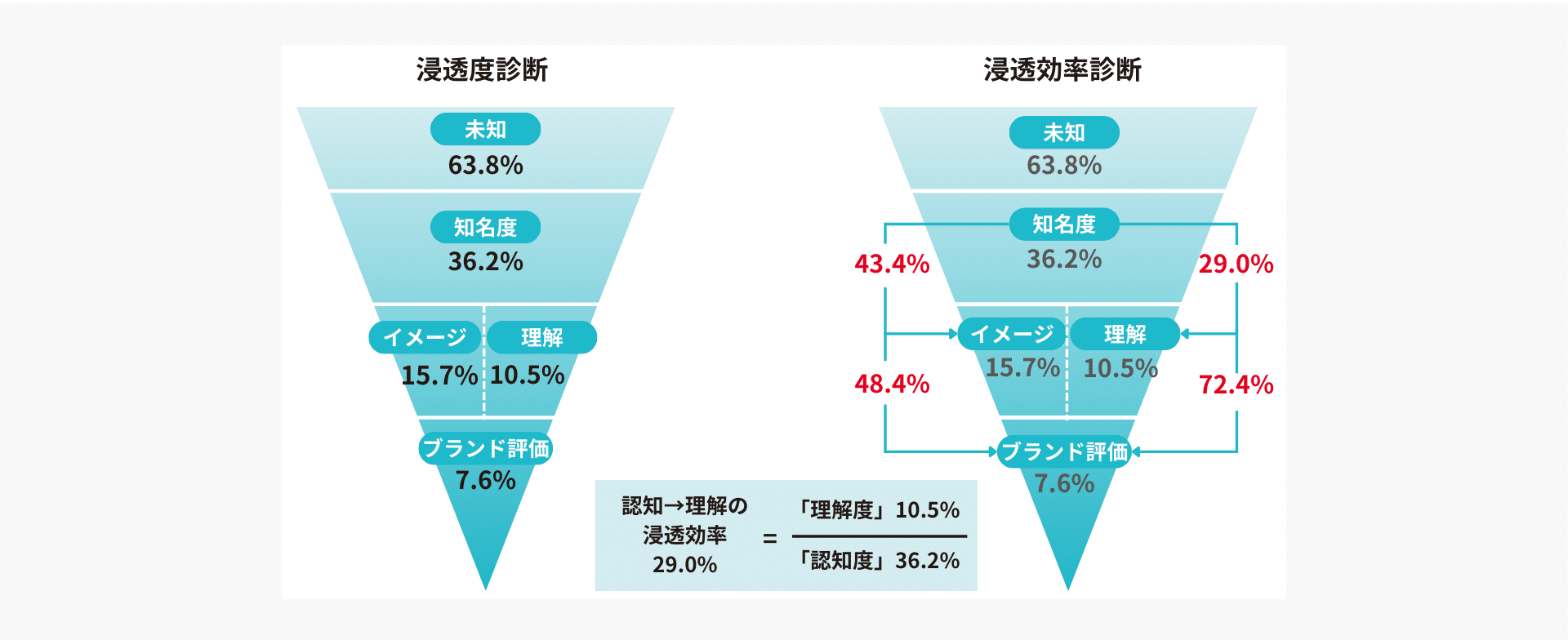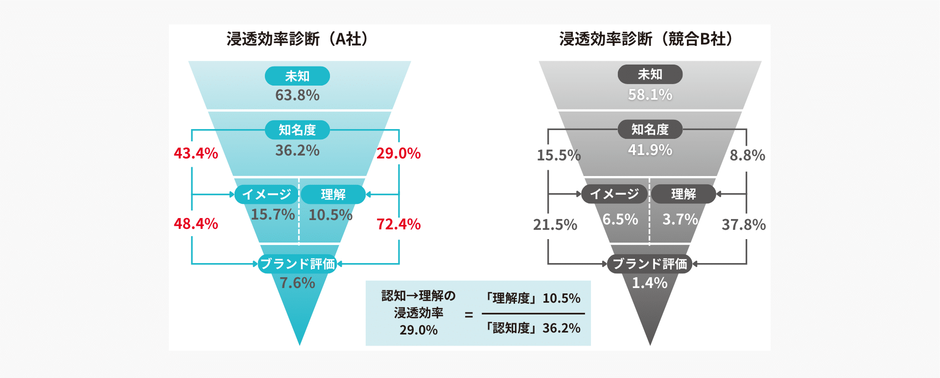 貴社及び競合他社のブランド浸透効率を比較することで、貴社の「強み・弱み」を明らかにします。
