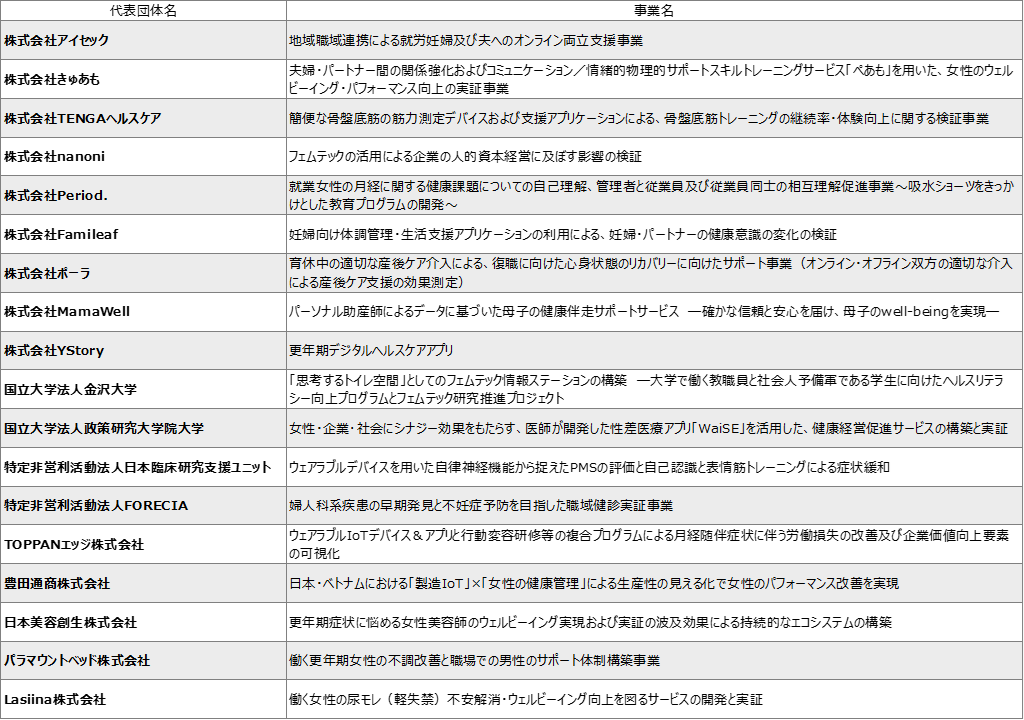 経済産業省 令和5年度「フェムテック等サポートサービス実証事業費補助金」における 補助事業者の公募結果の公表(2023年8月1日更新)